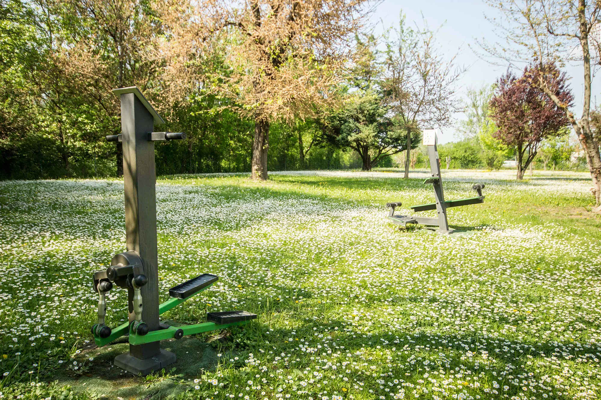 Palestra esterna con attrezzatura Skyfitness nel giardino dell’hotel, disponibile gratuitamente per tutti gli ospiti.